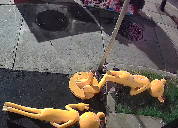 The Chinatown Business Improvement Area (BIA) released a surveillance video to Instagram that shows three people kicking the sculptures.